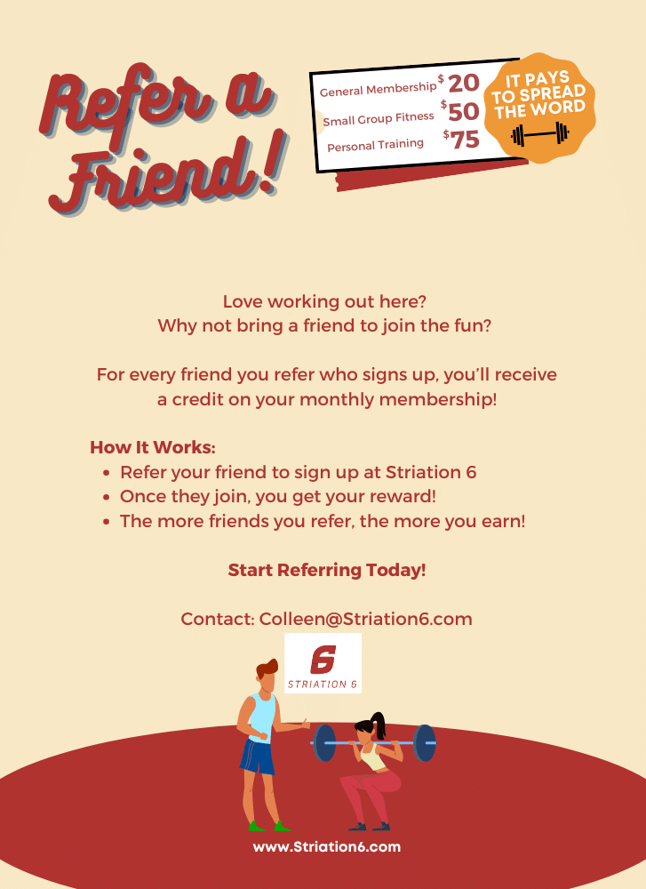 At Striation 6, we love it when friends or family members exercise together. It’s fun and uplifting to see people enjoying exercise while spending time with friends and loved ones. We also have a referral bonus system where you can save money when referring friends to our gym. A free gym trial will be available to all of your referrals.