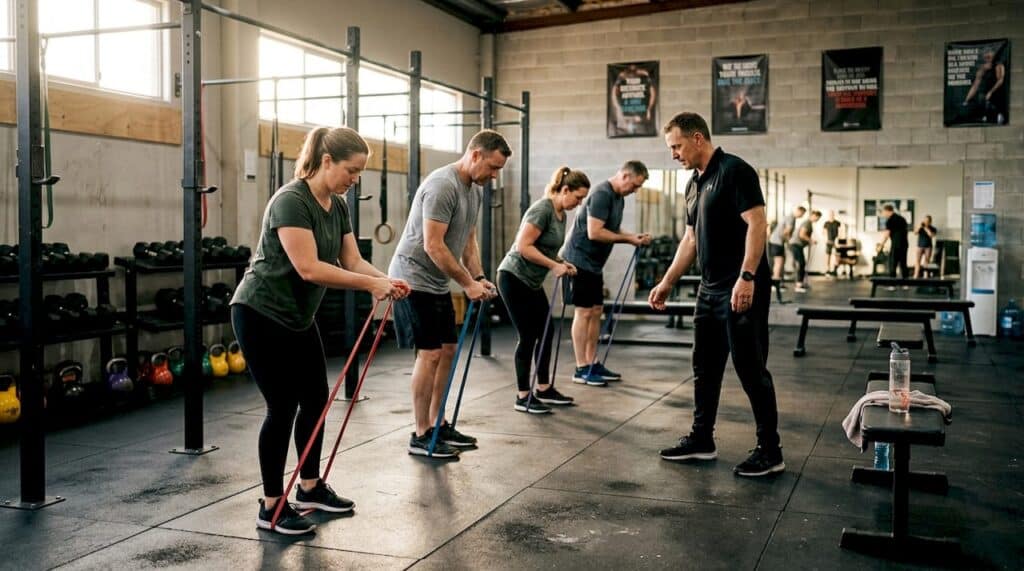 Small group training is a coach-led format with typically 3 to 10 participants per session. It is not a spin-off of a large fitness class. The key difference is intentional programming. Every session is built around a specific goal, whether that is building strength, improving conditioning, or increasing flexibility, and the coach actively monitors and adjusts each participant’s form and effort.